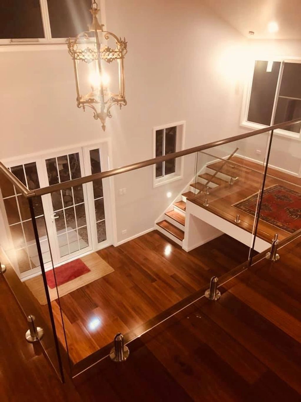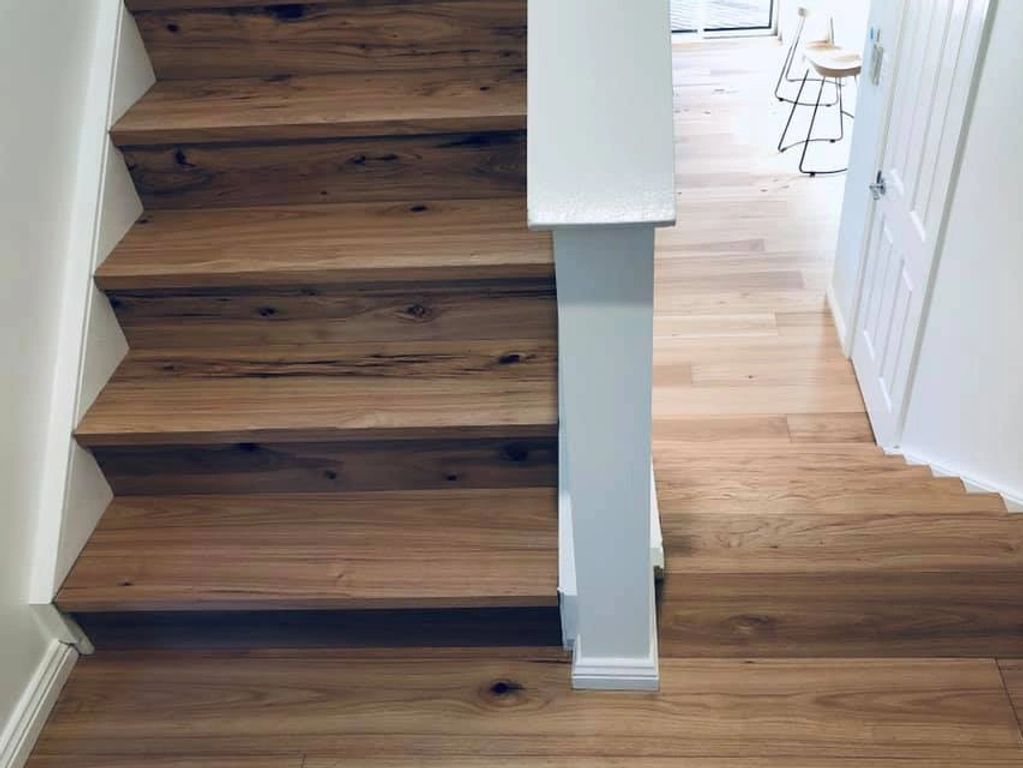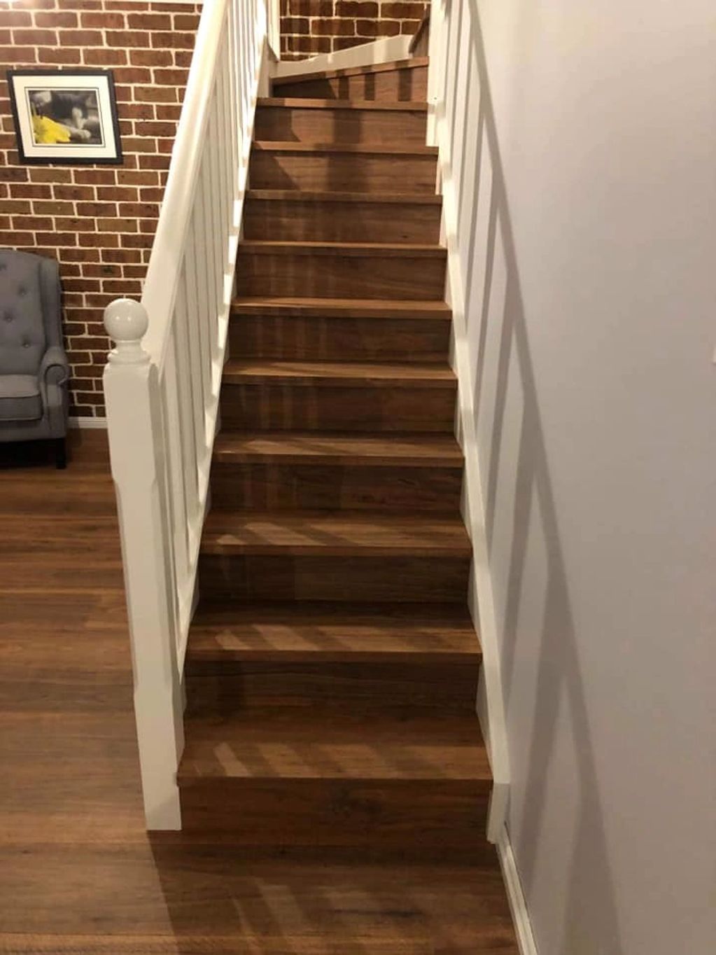 Quickstep Majestic Spotted Gum laminate with custom stair nosing. The client wanted a durable floor finish that still looked stylish on her stairs.