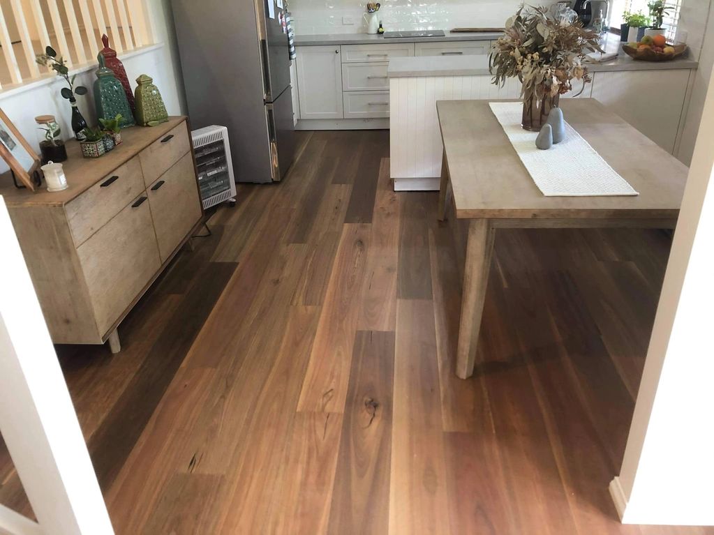 Regency Hardwood Spotted Gum wide boards in a Matt Finish. The client wanted to replace an existing laminate floor with higher end timber, as the kitchen had just been renovated.